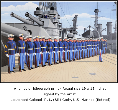 Included with each copy of the print is a colorful pamphlet that describes the uniforms and events depicted, and provides a brief history of this famous battle wagon. Also in the pamphlet is a complete roster of the Marine Guard assigned to the USS Nevada when she was first commissioned.