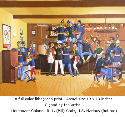 The Marines enjoying “Happy Hour” are from various periods in Marine Corps history. They are celebrating the bonds that make all generations of Marines brothers. Each wears the uniform of his time – from the green coated Leathernecks of American’s War of Independence, to the modern Marine in the famous dress blues recognized the world over.