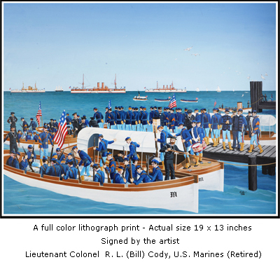 Included with each copy of the print is a colorful pamphlet that describes the ships, uniforms, and historical events depicted. Also in the pamphlet are the names of the Marine officers and NCOs who manned the ships.